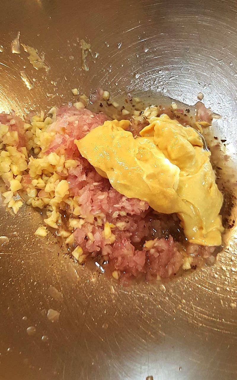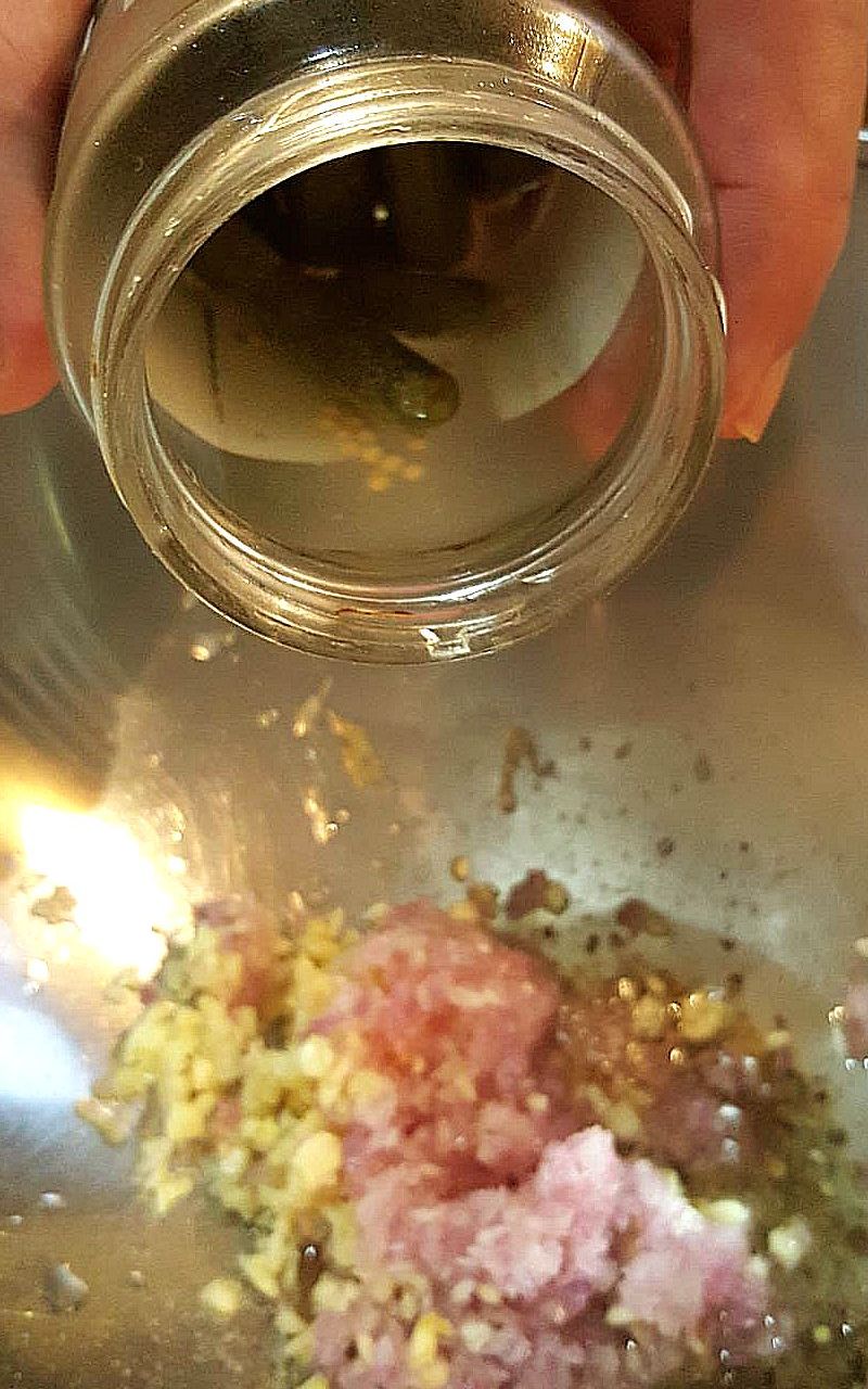 No quantities, no measure? You decide according to your taste, write down how much you use this time, then you will tune up the proportions to make it exactly to your liking after a few times. It will be your personal recipe. Aim for a creamy sauce that you can use for dipping, or as salad dressing by adding a little extra olive oil when you toss your greens.